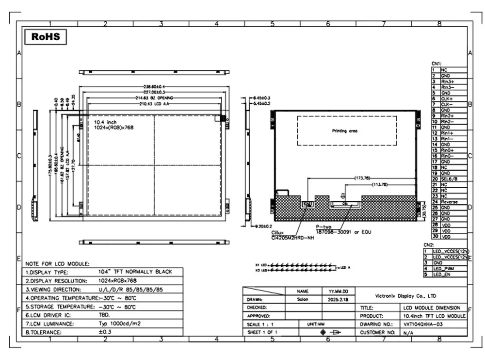 Този Victronix 10.4 инча 1024 × 768 LVDS Висока яркост TFT модулът е високоефективен 10,4 инчов TFT-LCD модул, проектиран за надеждност в индустриална среда. С участието на IPS панел с разделителна способност 1024 × 768 и 16,7 милиона цвята, той осигурява изключителна визуална яснота с широки ъгли на гледане от 85 ° (3/6/9/12 O’Clock посоки). Освен това той предлага 1000 CD/m² висока яркост, съотношение на контраст 1000: 1 и 80% равномерност за ясно гледане при пряка слънчева светлина. Като професионален производител и доставчик на TFT модули в Китай, този модул Victronix 10.4 инча TFT модул е напълно съвместим с екологичните стандарти на ROHS, като гарантира превъзходни резултати от приложението. Ние предлагаме персонализирана услуга, за да отговорим на нуждите на нашите клиенти.
