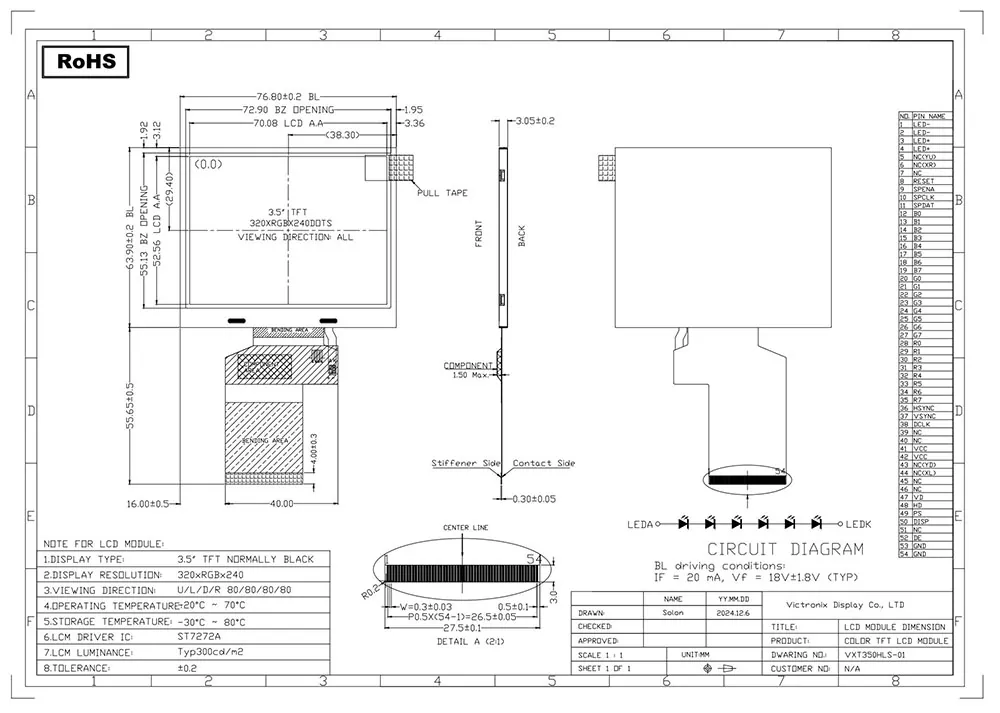 TFT LCD е вид дисплей с течен кристал, който използва технологията с тънки филми за подобряване на качеството на изображението и има множество приложения в ежедневието. Като професионален производител и доставчик на модули TFT в Китай, какво прави Victronix 3,5 инча 320 × 240 QVGA IPS TFT модул различен от другите производители? Първо, той предлага типична яркост от 300 Cd/m², широки ъгли на зрение 80 ° във всички посоки и контрастно съотношение 800: 1, осигурявайки отлична четимост от различни ъгли. Второ, той интегрира единица за подсветка, използваща 6S бели светодиоди с типичен живот от 30 000 до 50 000 часа (до 50% първоначална яркост), като гарантира ясна видимост при всички условия на осветление. Освен това той поддържа RGB 24-битов интерфейс с контролера ST7272A. В допълнение, той преминава строги тестове за околната среда, включително термичен шок (-30 ° C ↔ +80 ° C цикли), съхранение на влажност (60 ° C/90% RH) и механични вибрации, като се гарантира, че може да работи безпроблемно през удължен температурен диапазон (-20 ° C до +70 ° C).