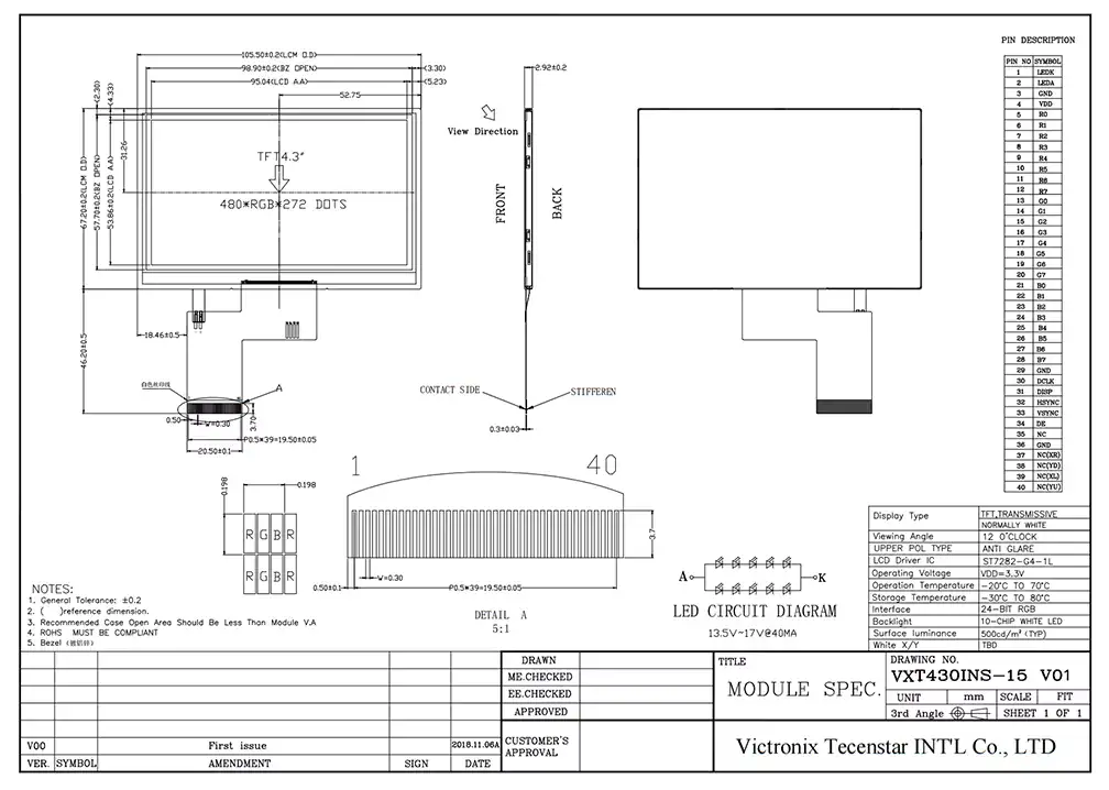 Този Victronix 4.3 инча 480x272 TN TFT модул е високоефективен 4,3-инчов TFT LCD модул, проектиран за надеждност в взискателни приложения. С участието на 480 × 272 разделителна способност и 24-битов RGB паралелен интерфейс, този дисплей осигурява Crisp 16.7m-цвят визуализации с активна зона 95.04 × 53.86 mm. Като професионален производител и доставчик на TFT модули в Китай, ние сме горди, че представяме Victronix 4.3 -инчов TFT модул. Този продукт стриктно се придържа към екологичните стандарти на ROHS, като гарантира изключителна ефективност на приложението. Освен това ние предлагаме персонализирани услуги, за да отговорим на уникалните нужди на нашите клиенти.