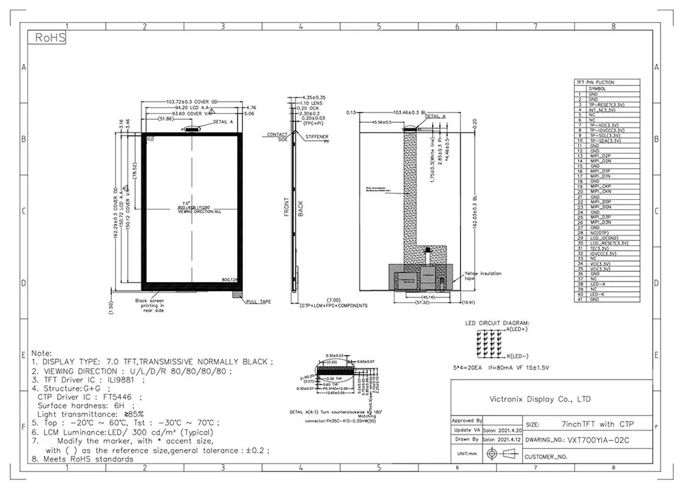 VXT700YIA-02C е TFT-LCD модул. Той е съставен от TFT-LCD панел, драйвер IC, FPC, задна светлина и CTP. Областта на дисплея 7.0 ¢¢ съдържа 800 x (RGB) x 1280 пиксела и може да показва до 16,7m цветове. Този продукт съответства на критерия за околната среда на ROHS ..