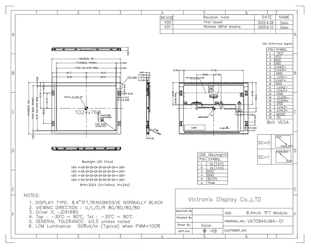 TFT LCD е вид дисплей с течен кристал, който използва технологията с тънки филми за подобряване на качеството на изображението и има множество приложения в ежедневието. Като професионален производител и доставчик на модули TFT в Китай, какво прави Victronix 8.4 инча 1024 × 768 IPS TFT LCD различен от другите производители? Първо, той предлага типична яркост от 500 Cd/m², 85 ° с широки ъгли на видимост от всички посоки и контрастно съотношение 1500: 1, осигурявайки отлична четимост от различни ъгли. Второ, той интегрира единица за подсветка, използваща 32 бял светодиод с типичен живот от 50 000 часа (до 50% първоначална яркост), като гарантира ясна видимост при всички условия на осветление. Освен това той поддържа интерфейс на LVDS с ESD защита и JD9168S контролер. В допълнение, той преминава строги тестове за околната среда, включително термичен шок (-30 ° C ↔ +80 ° C цикли), съхранение на влажност (60 ° C/90% RH) и механични вибрации, като се гарантира, че може да работи безпроблемно през удължен температурен диапазон (-30 ° C до +80 ° C).